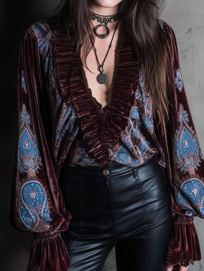 Boho Paisley Print Velvet Puff Sleeve Blouse