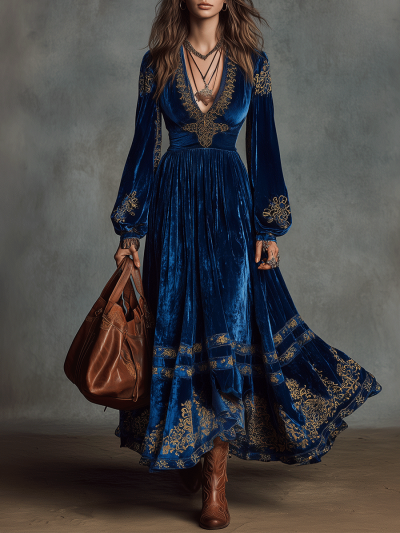 Vintage Bohemian Sapphire Velvet Maxi Dress