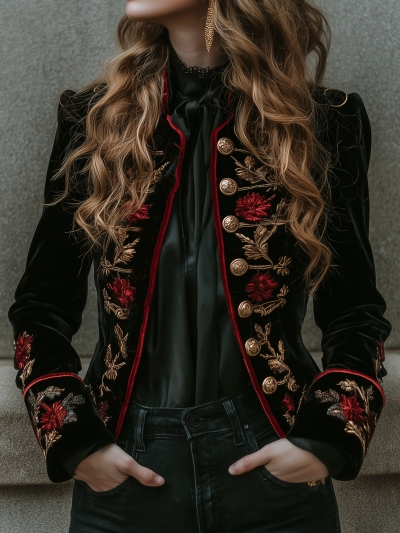 Vintage Black Velvet Embroidered Military Gold Button Blazer