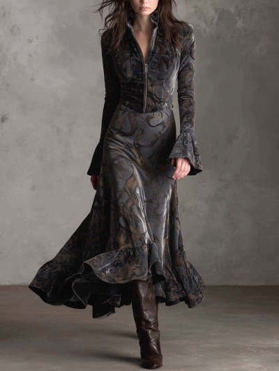 Vintage Snake-Print Velvet Maxi Dress