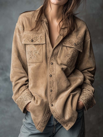 Vintage Suede Embroidered Front Zip Straight Jacket