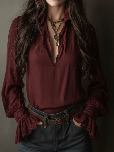 Boho V-Neck Deep Wine Red Blouse With Lace Cuffs