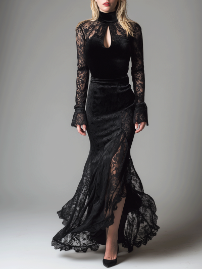 Elegant Lace-Sleeved Velvet Evening Maxi Dress