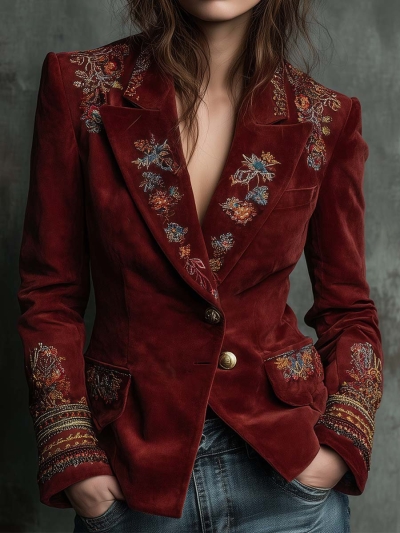 Vintage Burgundy Velvet Embroidered Blazer