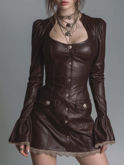 Vintage Button Lace Hem Faux Leather Mini Dress