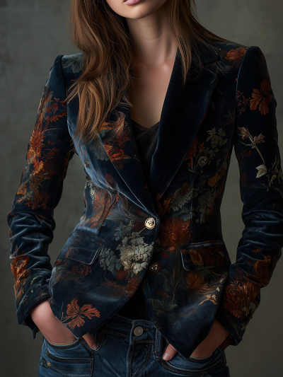 Vintage Floral Print Metal Button Polyester Velvet Blazer