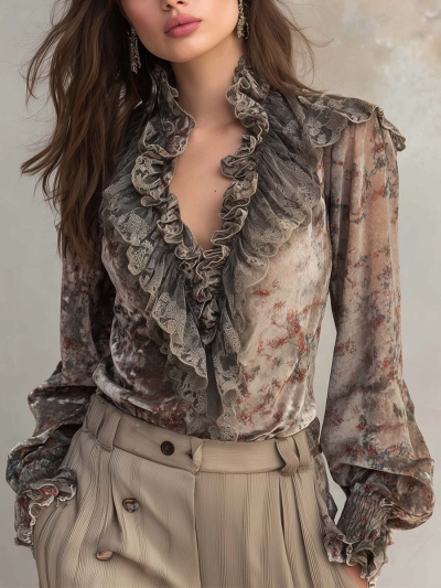 Velvet Ruffle Lace Blouse With Puff Sleeves