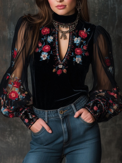 Retro Velvet Embroidered Mesh Stitching Blouse