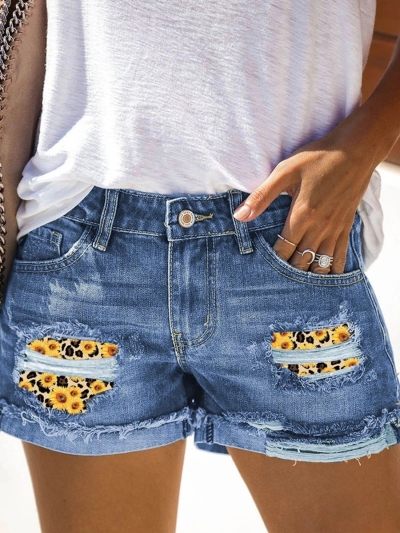 Daisy Patchwork Distressed Pockets Denim Shorts