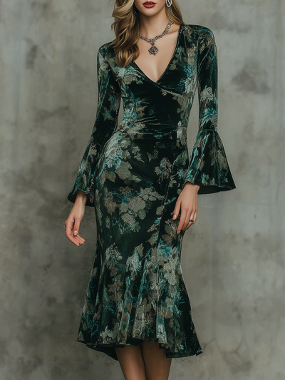 Vintage Emerald Floral Velvet With Flared Sleeves Midi Dress