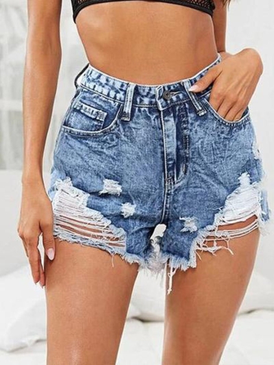 Solid High Waist Ripped Denim Shorts