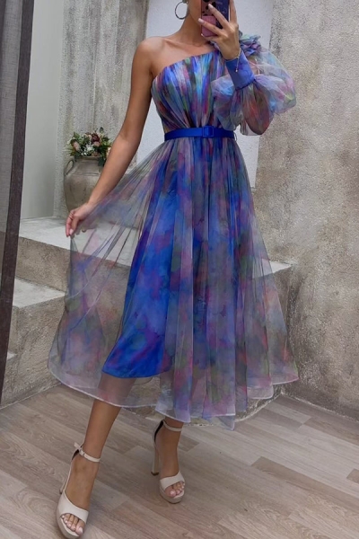 Monroe Tulle Floral Pleated One Shoulder Sleeve Belt Swing Midi Dress