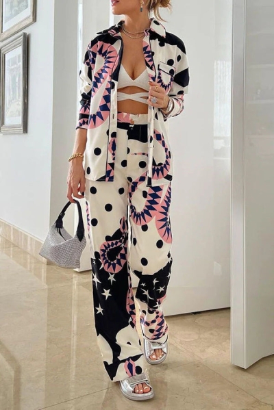 El Paraiso Creative Printed Oversize Pocket Shirt and Wide Leg Pants Set