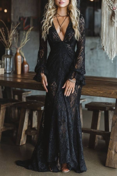 Lace deep V-neck bell sleeve fitted long dress