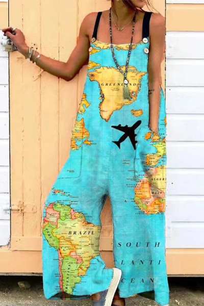Dragon Family Linen Blend Printed Elastic Waist Pocketed Wide Leg Pants