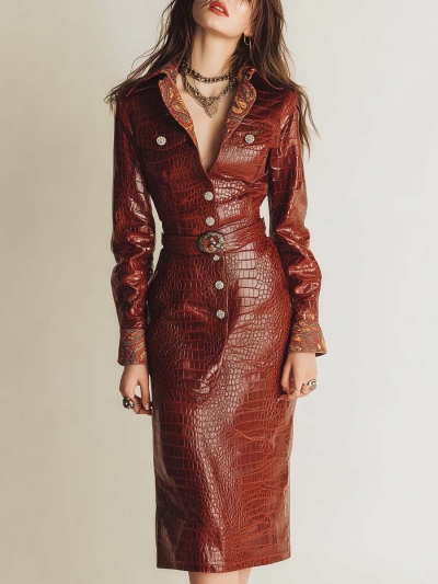 Vintage Western Eco-Crocodile Textured Leather Shirt Dress
