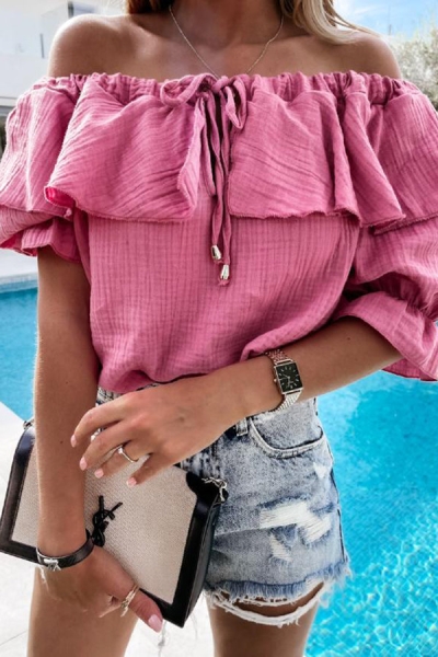 Off Shoulder Ruffle Solid Short Sleeve Shirt