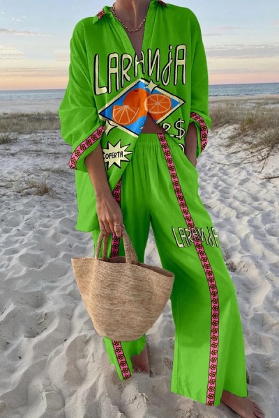 Fruit Print Oversized Shirt and Elastic Waist Pocket Pants Set