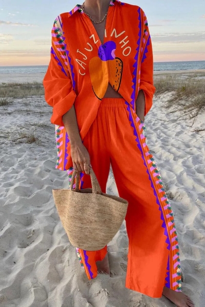 Orange Print Oversized Shirt and Elastic Waist Pocket Pants Set