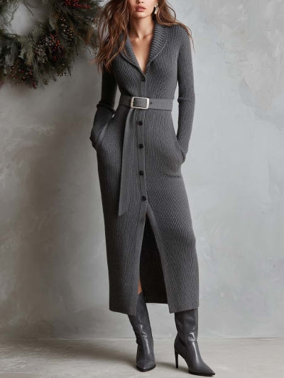 Ribbed Knit Belted Maxi Cardigan Dress With Shawl Collar