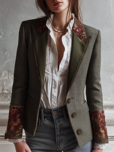 Bohemian Wool Plaid Retro Flower Splicing Blazer
