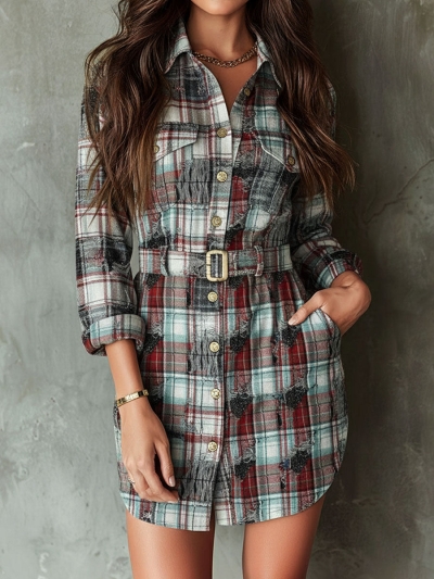 Western Rust Sage And White Plaid Belted Shirt Dress With Lurex Fabric