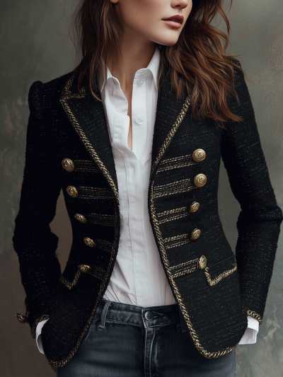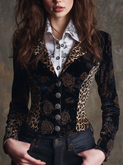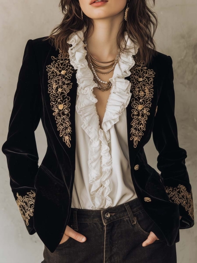 Embroidered Velvet Blazer With Gold Floral Detailing – Midnight Black