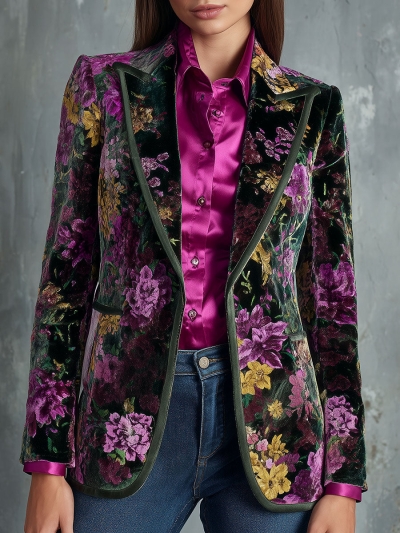 Retro Deep Green With Purple & Gold Botanical Pattern Velvet Blazer