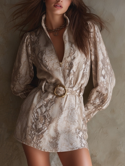 Stylish Snake Print Polyester Suede Mini Dress With Belt