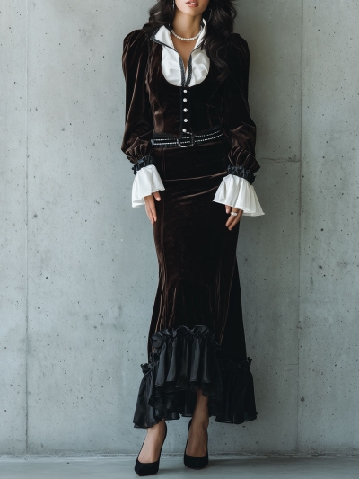 Victorian Dark Brown Velvet Buttoned Corset Maxi Dress With Ruffled Details