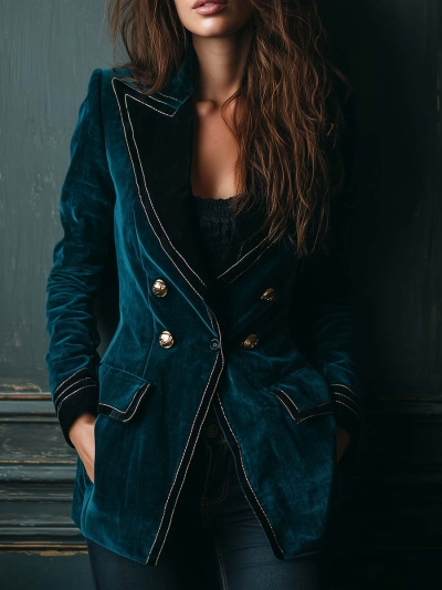 Elegant Polyester Velvet Blazer With Contrast Trim – Deep Teal