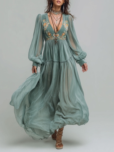 Retro Embroidered Chiffon Lantern Sleeve Maxi Dress