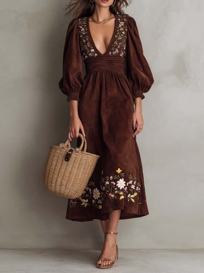 Embroidered Bohemian Puff-Sleeve Midi Dress