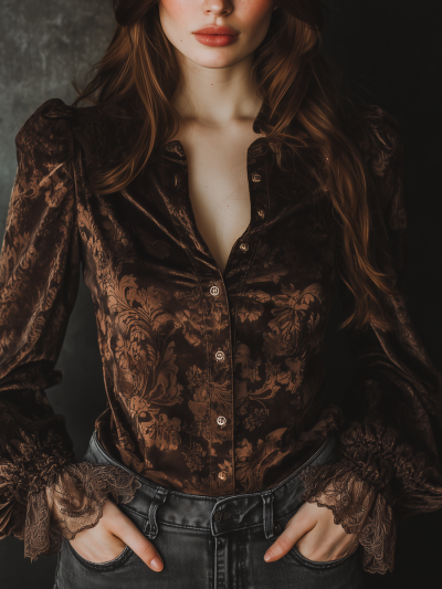 Vintage Printed Lace Cuffs Poly Velvet Blouse
