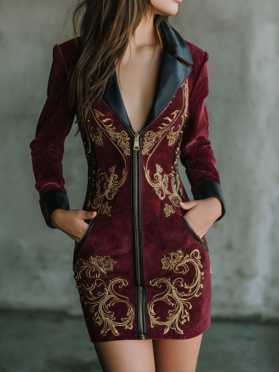 Retro Burgundy Microsuede Gold Baroque Embroidered Dress With Leather Trim