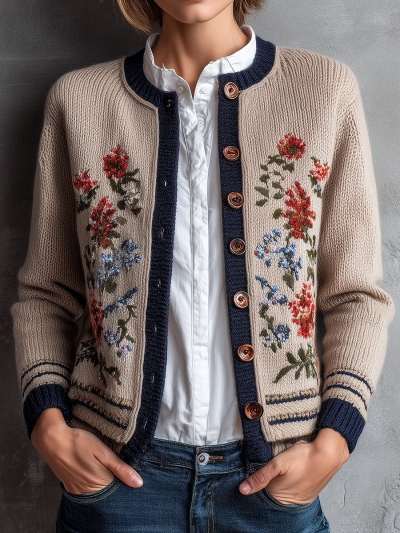 Retro Floral Embroidered Beige Knit Cardigan With Navy Trim