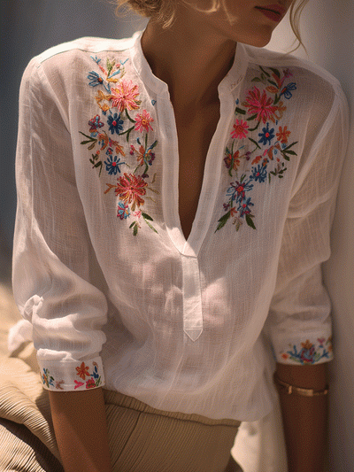 Bohemian Floral Embroidered White Shirt