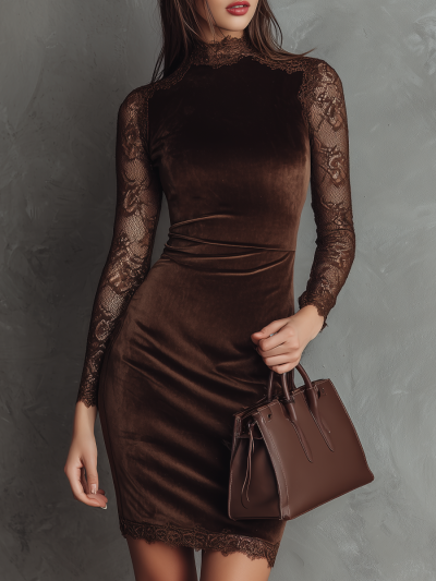 Retro Half-high Collar Lace Sleeves Mini Dress