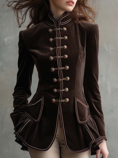 High-Neck Velvet Military Blazer With Gold Cord Buttons – Mocha Brown