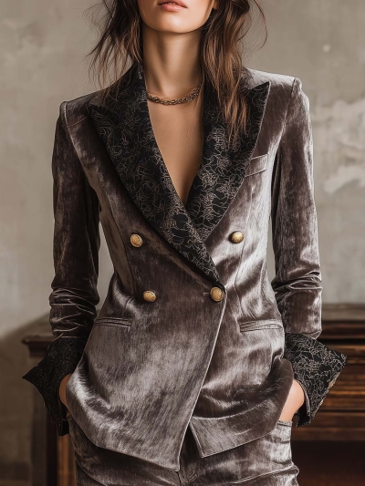 Velvet Blazer With Printed Lapel And Cuffs – Smoky Taupe