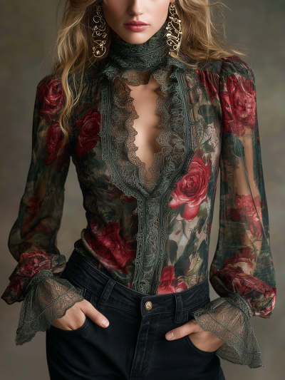 Vintage Romantic Rose Floral Lace Sheer Blouse