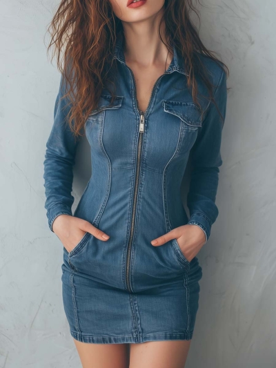 Vintage Zipper Placket Distressed Denim Mini Dress