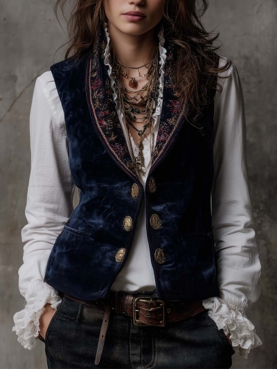 Navy Velvet Embroidered Lapel Vest